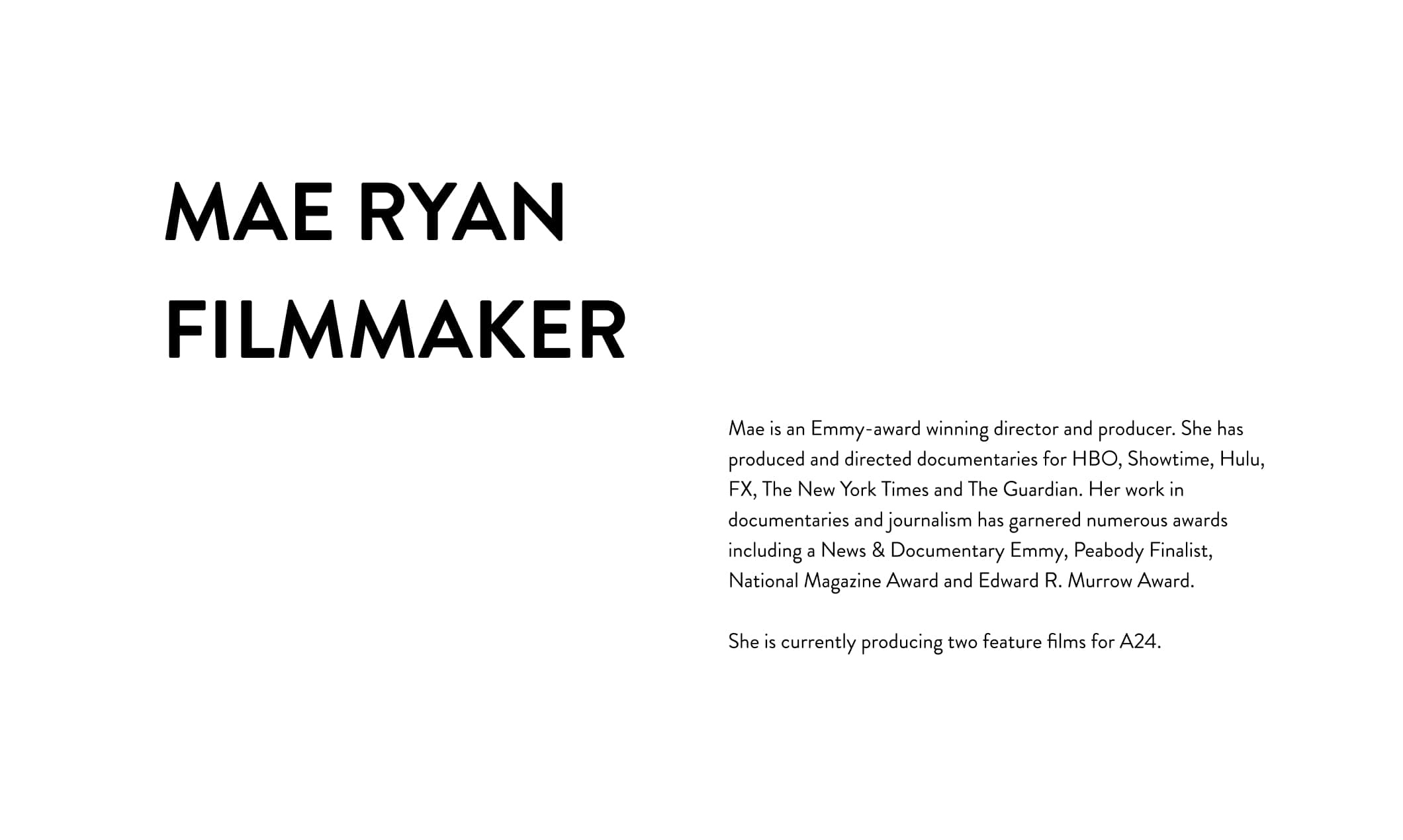 Mae Ryan is an incredibly talented Director and Photographer whom I met through some friends in L.A. At the time she was after a job at the New York Times. We created a logo/brand and portfolio website to help give her work a nice home.
