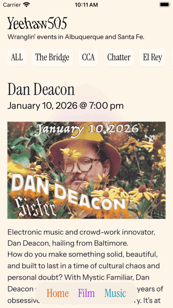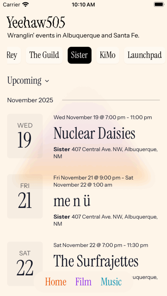 When I first moved to Albuquerque I really wanted to make a tool that would be helpful to the community and be a fun challenge to create. As I observed and engaged I noticed there wasn’t a locally run events platform that didn’t rely on Facebook, Instagram, or something other gross big tech solution. This bothered me and I felt like I could do something about it.